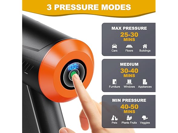 - Superior Pressure and Versatile Modes: Achieve up to 1000 PSI/2.5Mpa working pressure, surpassing most cordless electric washers. With 3 adaptable modes, switch effortlessly from strong jetting to economical cleaning using the button on the screen.