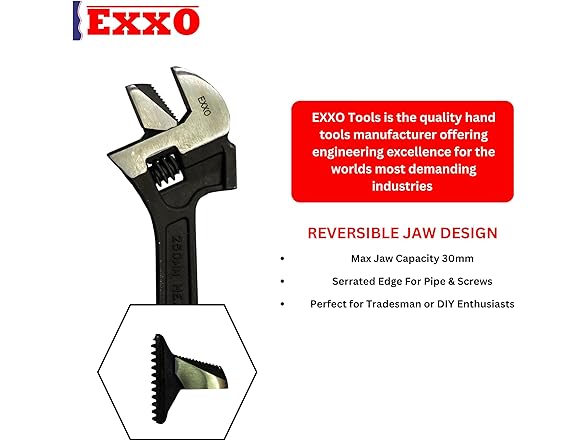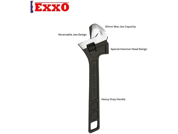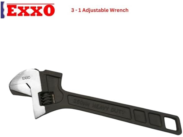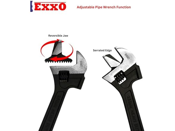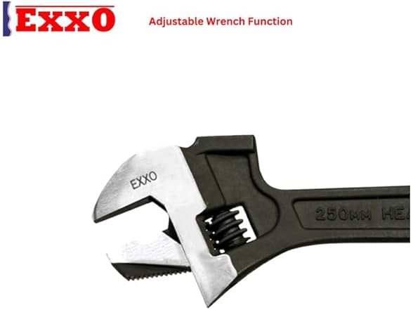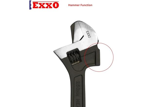 Maximize efficiency and minimize clutter with the EXXO Adjustable Wrench with Hammer Head; a powerful 2-in-1 tool that saves time, space, and effort. Expertly crafted from industrial-grade CRV steel, this 10-inch wrench features a reversible jaw that functions like a pipe wrench and a robust hammer head for striking tasks. Its corrosion-resistant finish and ergonomic, anti-slip grip make it suitable for extended use in tough environments. Whether you're tackling plumbing, mechanical repairs, or household DIY projects, this tool delivers the performance and adaptability professionals demand and homeowners appreciate. With the EXXO hybrid wrench, one tool does it all beautifully.