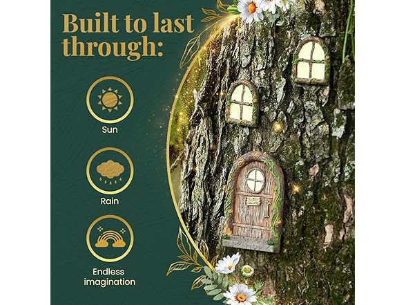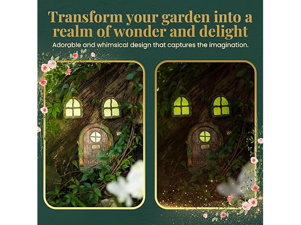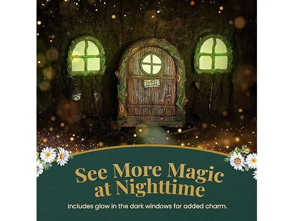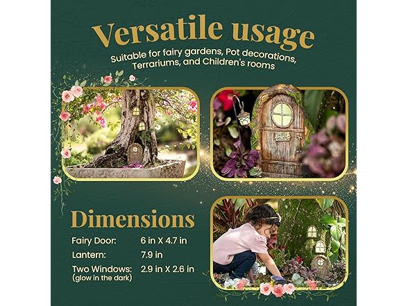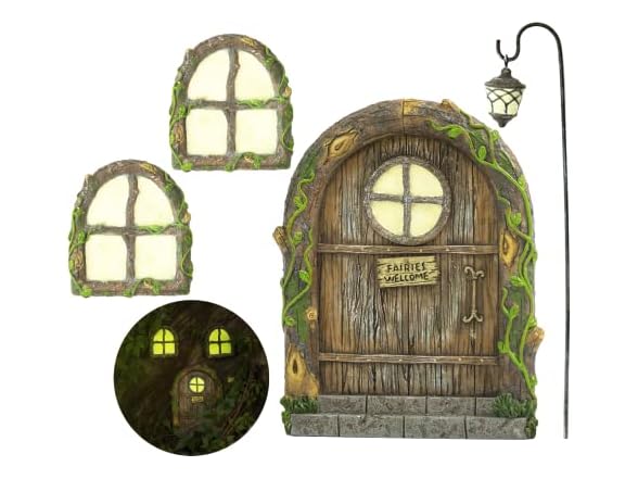 - Magic fairy door kit: Create a whimsical and enchanting fairy garden with our Fairy Garden Kit. This kit includes everything you need to bring your fairy dreams to life, including a fairy door , glow two the dark windows, and a little lantern. Transform your outdoor space into a magical realm with these fairy house decor and fairy garden accessories. Let your imagination soar as you create a tiny treehouse for your fairy friends using our fairy door kit. This fairy houses for outside is perfectly sized for bringing your garden to life.