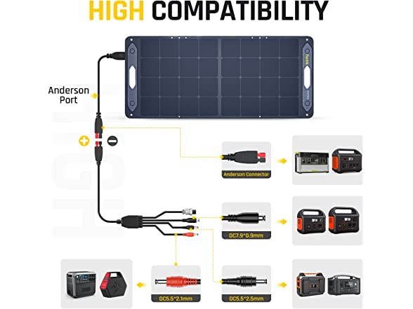 - DIVERSE COMPATIBILITY WITH MOST POWER STATIONS: Compatible with more than 90% of portable power stations on the market. Providing charging support with 4 different sizes of connectors for Fanttik EVO 300, Jackery Explorer 240/300/500/1000/1500, FLASHFISH 200w/300w, Anker 535/545, Bluetti EB55/EB3A/EB70S/AC200P, etc.