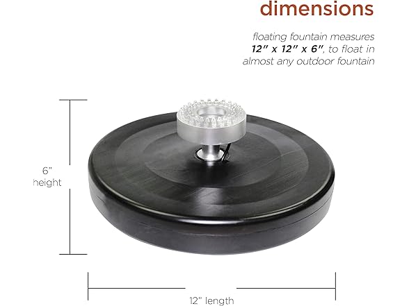 - COMPACT SIZE WITH SUPPORT: Measuring 12"L x 12"W x 6"H, this compact floating fountain fits in most outdoor ponds or pools and includes a one-year manufacturer’s support from Alpine Corporation for added reliability.