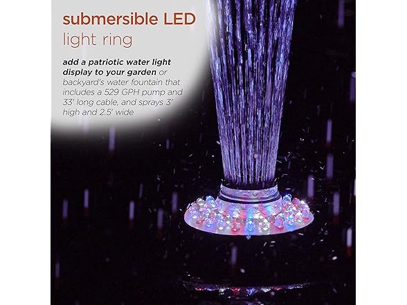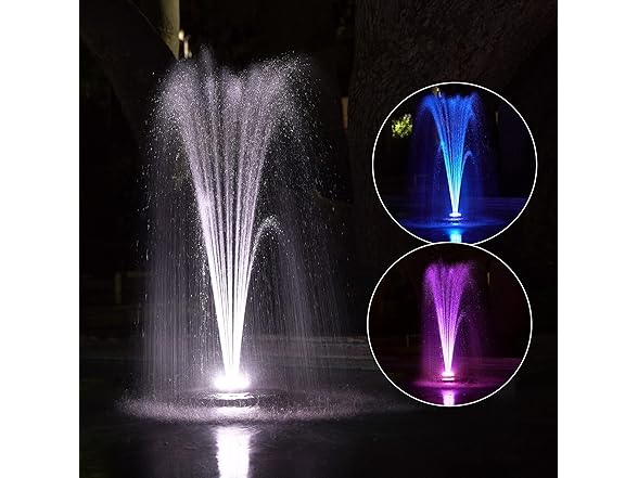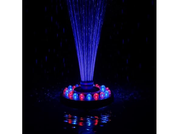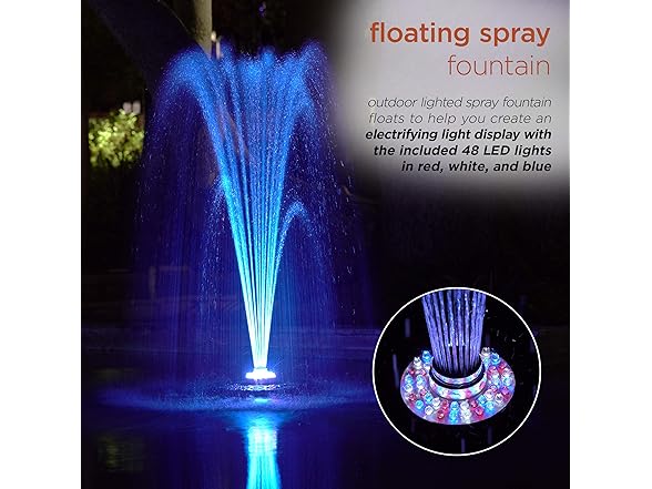 - FLOATING SPRAY FOUNTAIN: Enhance your pond or pool with a floating spray fountain that delivers a soothing water display while creating vibrant color effects through its 48 built-in LED lights in red, white, and blue.