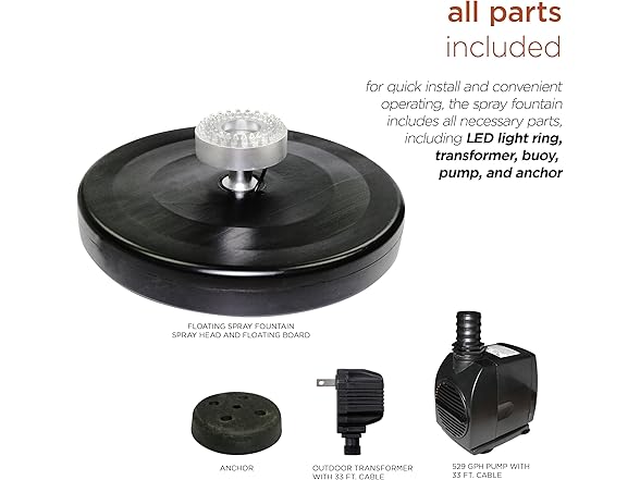 - ALL-IN-ONE KIT: Includes everything needed for quick installation and smooth operation, such as a durable buoy, secure anchor, 48-light LED ring, transformer, and high-powered pump to set up easily in minutes.