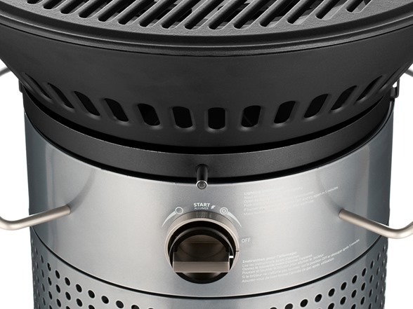 - Featuring a hinged door for propane tank storage, easy to clean residue tray, electronic ignition and anti-tilt locking wheels