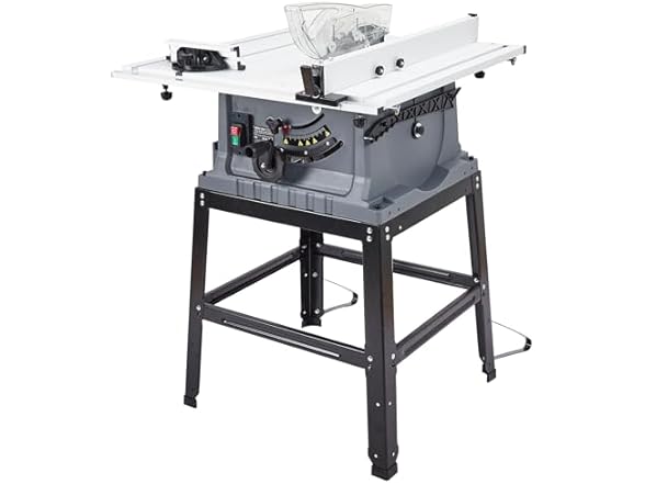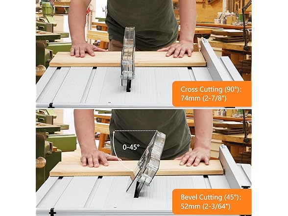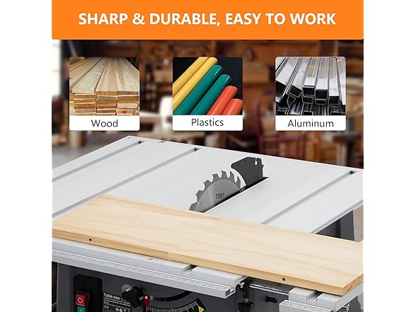 - [Safety Design] The table saw has a transparent blade guard which can provide a clear view and prevent hurt due to accidental touch. And it also comes with a push stick to enhance security during operation. Furthermore, On-off switch and overload protection are equipped for added safety.