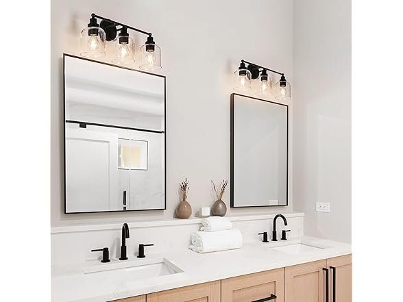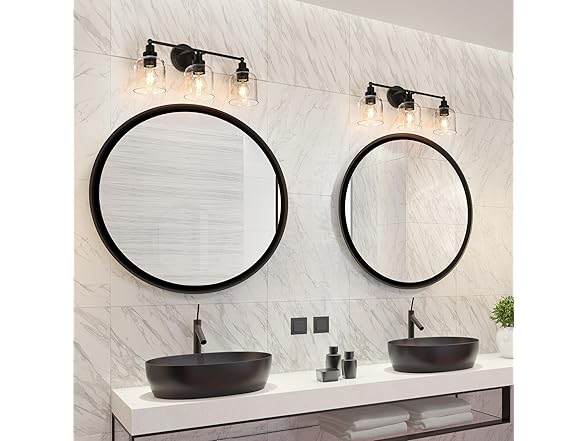 - Sleek Matte Black Elegance & Premium Craftsmanship: Crafted from robust metal and adorned with a refined matte black finish, the bathroom wall lamp boasts remarkable durability, ensuring years of dependable use. Paired harmoniously with clear glass shades, our bathroom vanity light casts an enveloping, non-glaring illumination throughout your space.