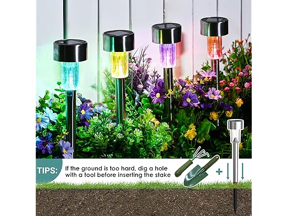 - 【Easy To Assemble】No tools required! Simply flip the switch and insert the solar garden lights into the ground. For best results, dig a small hole first