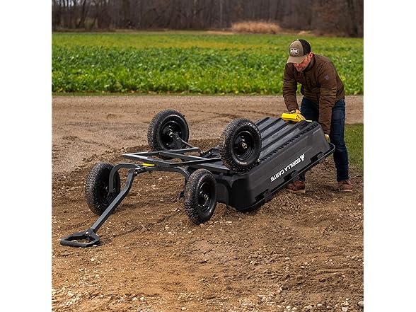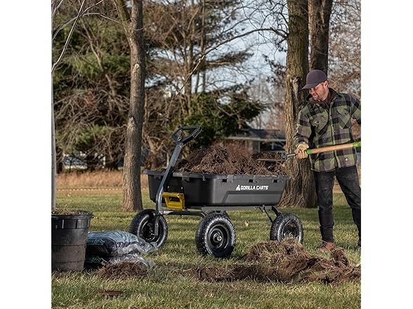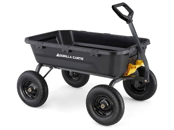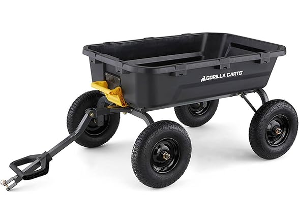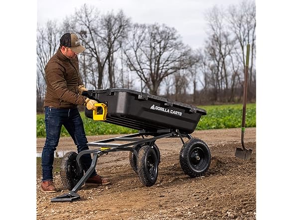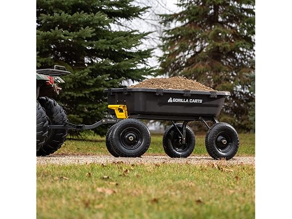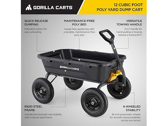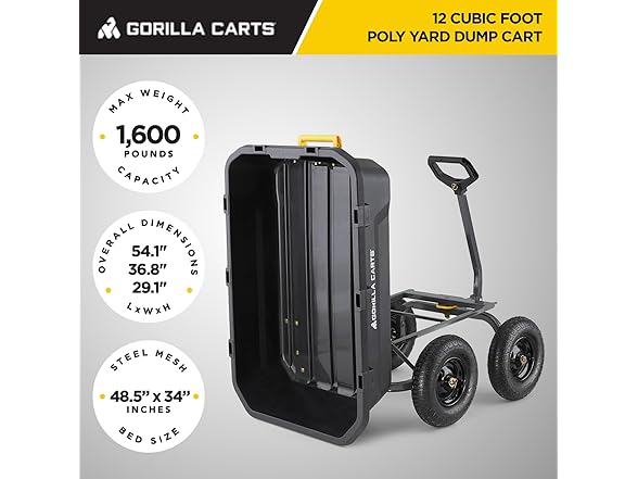 The ultimate in heavy-duty hauling, the new Gorilla Carts 12 cu. ft. Super Heavy-Duty Poly Dump Cart can do it all. Featuring a huge 48.5 in. x 34 in. x 11 in. high-strength poly bed and our full-dump design, the 1600 lbs. load capacity allows you to take on any project. The patented roll-over dump feature makes it easy to unload anywhere, and the back wheels pivot forward during dumping to help you empty the tub completely. The new dump mechanism is wider and easier to use, and the oversized 2-in-1 handle allows the cart to be pulled by hand or easily converted to tow behind a lawn tractor or ATV. High-quality 16 in. pneumatic tires keep this workhorse on the move and allow you to roll easily over any terrain. This strong and durable cart is always ready to tackle your next big yard project.