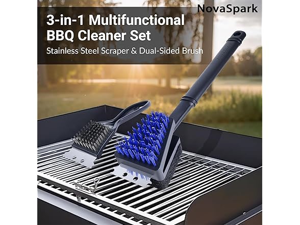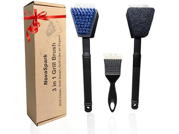 Elevate Your Grill Game with NovaSpark All-in-One Cleaning Solution Tired of fumbling with multiple, ineffective tools to clean your grill? Introducing the Professional Grill Cleaning System – the innovative 3-piece kit engineered to make grill maintenance thorough, safe, and remarkably efficient. This isn't just another brush; it's a complete restoration kit for your prized grill. Experience Unmatched Cleaning Power & Versatility: Triple-Action Brush Head: Each brush features a unique head that combines stiff nylon bristles for deep scrubbing, an absorbent sponge for seamless wiping, and a sturdy stainless steel scraper to tackle baked-on grease and stubborn carbon deposits. No residue stands a chance. Strategic Dual-Size Design: Master every cleaning task with two full-size 15-inch brushes for large surfaces and a compact 8-inch detail brush for corners, edges, and smaller grills. This optimized selection ensures maximum efficiency for both post-barbecue cleanups and quick touch-ups. Uncompromising Safety: Our commitment to your family's well-being is paramount. Engineered with premium, specially formulated nylon filaments, our brushes are completely bristle-free and shed-resistant, eliminating the dangers associated with metal wire brushes. Enjoy peace of mind with every clean. Built for Performance and Durability: The professional-grade scraper is reinforced for maximum scraping power and paired with an ergonomic, non-slip rubber handle for secure control and comfort. Universally compatible with porcelain, ceramic, infrared and all other major grill types, this kit is the only tool you'll need. Important Usage Guidelines: To ensure longevity and safety, always clean on a completely cooled grill. Hand wash with mild detergent and hang to dry. (Note: Plastic components are not heat-resistant). Order now and transform your grill cleaning routine from a chore into a breeze!