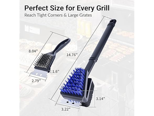 - Optimized Tool Selection for Every Task: Our dual-size brush system offers strategic cleaning versatility: use the 15" main brush for large surface areas and the 8" detail brush for corners, edges, and smaller grills. The thoughtful size combination ensures efficient cleaning for both extensive grill sessions and quick maintenance jobs