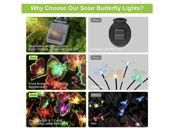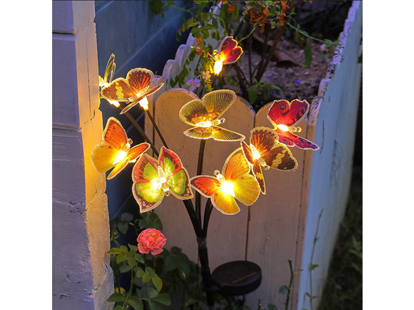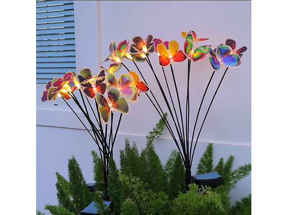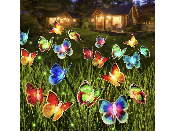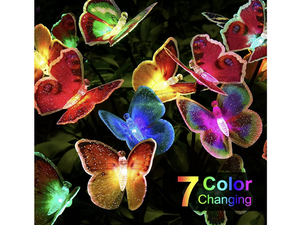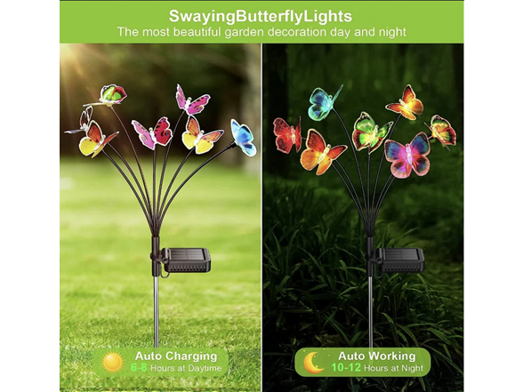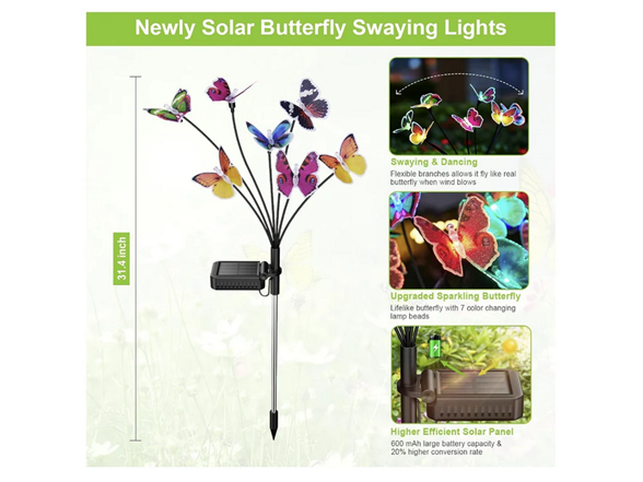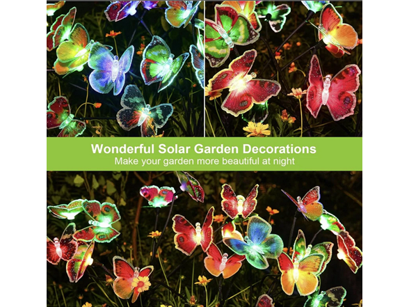- Swaying Butterfly Solar Garden Lights - Having 21 lifelike butterflies, our solar lights for outside will gracefully flutter in the breeze and fly around your garden like a real butterfly when wind blows. Sparkling butterfly firefly lights solar outdoor with 7 color changing modes are perfect for adding a touch of charming atmosphere for your outdoor space when they light up at night. These solar lights outdoor sure to draw admiring glances from all who pass by.