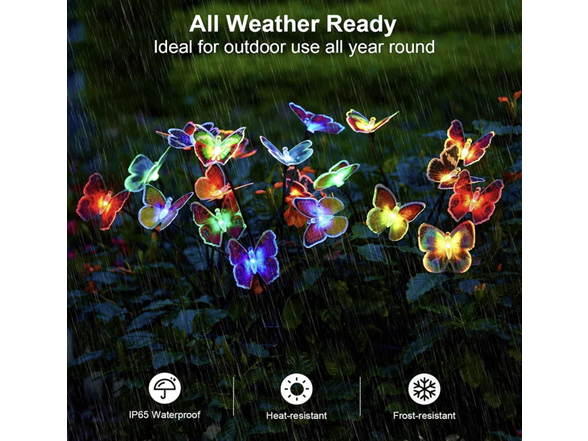 - Sturdy and Weather-Resistant - The IP65 waterproof and sturdy design allow the solar garden lights to work stably under long-term outdoor exposure. The rugged stainless-steel stakes hold the solar butterfly lights securely in the ground. In windy weather, you can enjoy beauty of the butterfly decorations swaying in the wind.