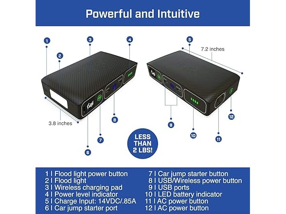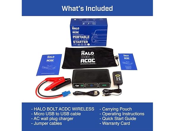 - ALL IN ONE EMERGENCY KIT - LED flood light, battery jump starter, jumper cables, AC wall charger, carrying pouch and 2x USB phone charger all in one package. The HALO Bolt can hold it’s charge for 18 months keeping you prepared for an unexpected power outage.