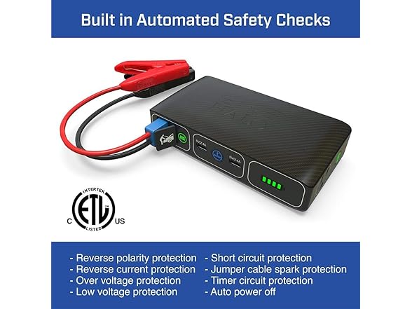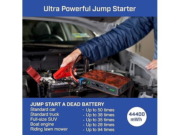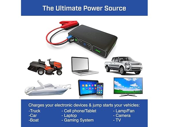 - CAR JUMP STARTER - Battery trouble isn’t an issue when your universal power bank includes enough power to jump start your car, boat, motorcycle or lawn mower, jumper cables included. Dead batteries can be unexpected, stay safe and be prepared with this portable jump starter.