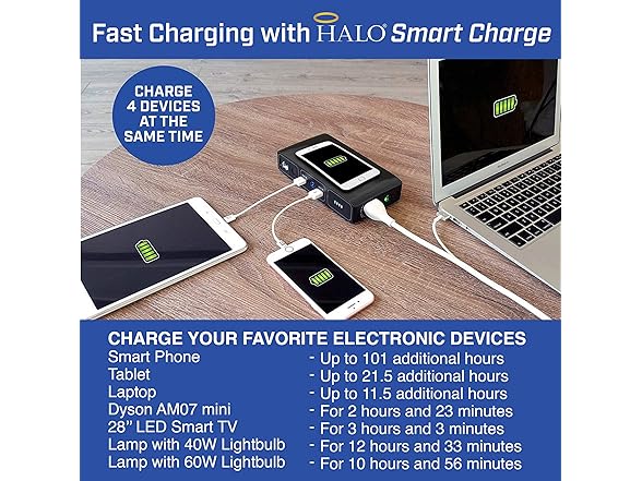 - UNIVERSAL LAPTOP AND PHONE CHARGER - Keep your Mac, PC, phone or tablet charged when traveling or use as a backup during a storm. 120V AC wall outlet powers your laptop on the go. Enough charge for 10.5 hours of battery life for a HP Pro Book, 98 hours for a Samsung Galaxy S9, or 66 hours of talk time on an iPhone 8. See picture chart for details.