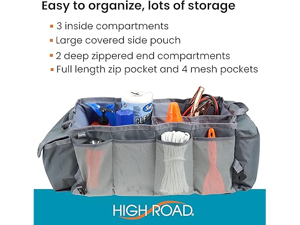 At High Road, we understand car organization better than anyone - we've been designing hard working car clean-up solutions from our office in Maine for over 30 years, and have more than 80 products to de-clutter the daily drive. Our versatile trunk organizer is no exception - with 11 ways to store and organize every kind of car gear it's sure to clean up your cargo.