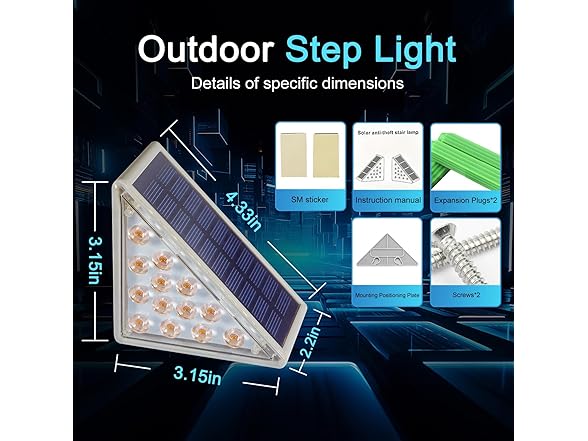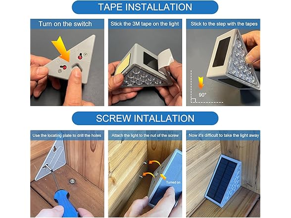 - 【Easy to Install】: No wiring or electricity is required. Solar stair lights need to be installed in a sunny place.solar lights for steps are perfectly decored on garden stairs, patio, yard, deck, porch step and sidewalk. There are 2 installation ways: 1)normal way:just put it in the corner of the staircase,if need,attached to the stairs by 3M sticky tape. 2)anti-theft way:fix the lights on the stair by screws to lock the accessories.