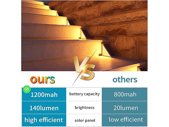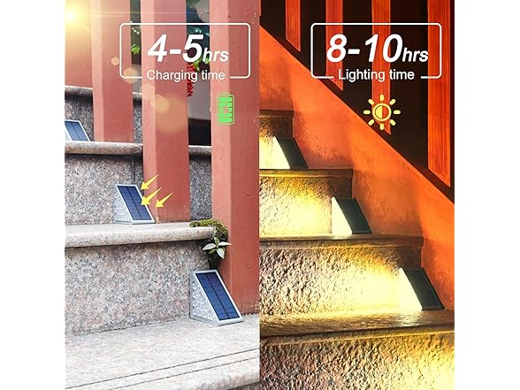 - 【Brighter &IP67 Waterproof】13 LEDs/140Lumens/ 1200mAh battery. Solar stair lights outdoor offer 6-12H illumination for your garden and yard stair after a full 4.5-hour charge, without external electricity. Solar stair lights are designed with reflective optical lens which can reduce the lighting loss and increase the brightness of the lights.Our outdoor solar step lights are made of high-quality ABS plastic and have an IP67 waterproof rating, making them suitable for outdoor use in various weather conditions.