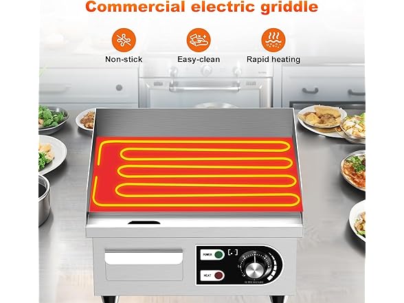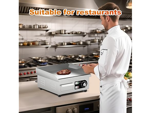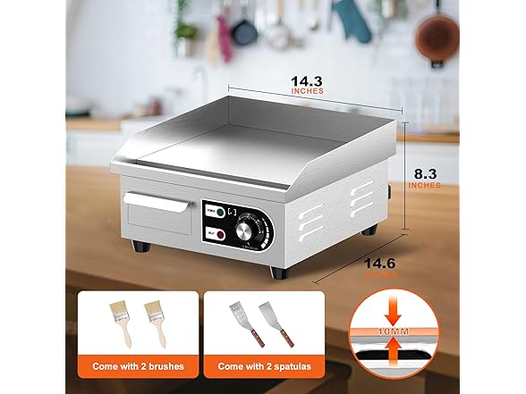 Affordable Griddle: Our 14-inch commercial flat top grill features a stainless steel body, which is sturdy and effectively protects internal components. The textured surface is made of iron with a thickness of 10mm (0.39 inches), enabling rapid heat conduction. The cooking area of the countertop griddle is 14'' * 12'', providing enough space to cook 10 eggs or 6 hamburger patties at one time. Adjustable temperature: You can control the temperature of the cooking surface via the temperature knob, with an adjustable range of 122~572°F (50-300°C). When heating up to the maximum temperature, cast iron electric griddle takes at most 10 minutes. The U-shaped heating tube quickly and evenly heats the surface of the griddle pan, ensuring stable heat. Non-stick cooking surface: This electric stainless steel griddle features a food-grade iron cooking surface that develops a natural non-stick coating through seasoning. The high-quality coating aids in the even distribution of heat, avoiding localized overheating and burning of food. Post-cooking cleanup is a breeze—just wipe the surface with a damp cloth, and it’s ready to go. User-friendly design: The electric griddle's pan is equipped with 2-inch high splash guards, which can effectively prevent oil from splattering onto the tabletop. The commercial griddle electric also features a detachable oil collection tray, making it convenient for you to collect food residues, oil, and other substances through the widened oil drain hole during cooking. Wide range of application scenarios: This 1500W electric flat top grill is very suitable for families or small restaurants. It can griddle-fry eggs, cook steaks, grill bacon and other ingredients. Thanks to its commercial properties, it heats up faster than household griddles. The nonstick electric griddle comes with 2 spatulas and 2 wooden brushes, which are daily tools used with the griddle.