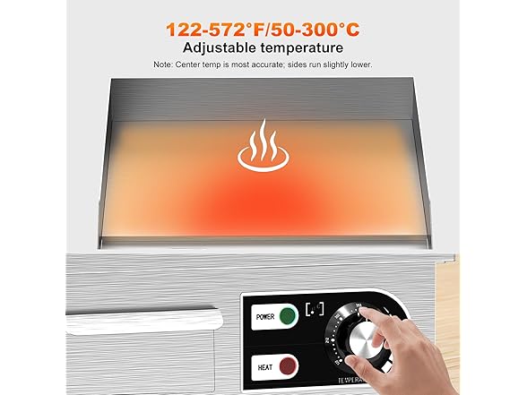 - Adjustable temperature: You can control the temperature of the cooking surface via the temperature knob, with an adjustable range of 122~572°F (50-300°C). When heating up to the maximum temperature, cast iron electric griddle takes at most 10 minutes. The U-shaped heating tube quickly and evenly heats the surface of the griddle pan, ensuring stable heat.