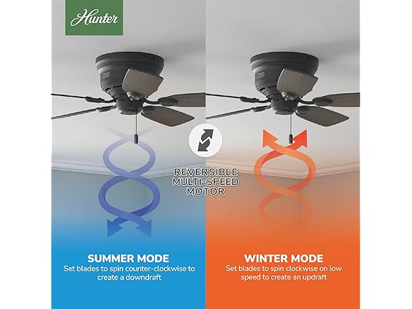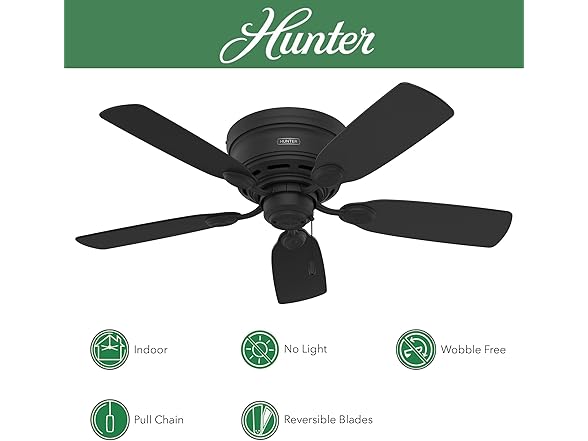 In the Box: (1) Hunter Fan 42 Inch Low Profile Matte Black Finish Indoor Ceiling Fan With 5 Blades and Pull Chain
