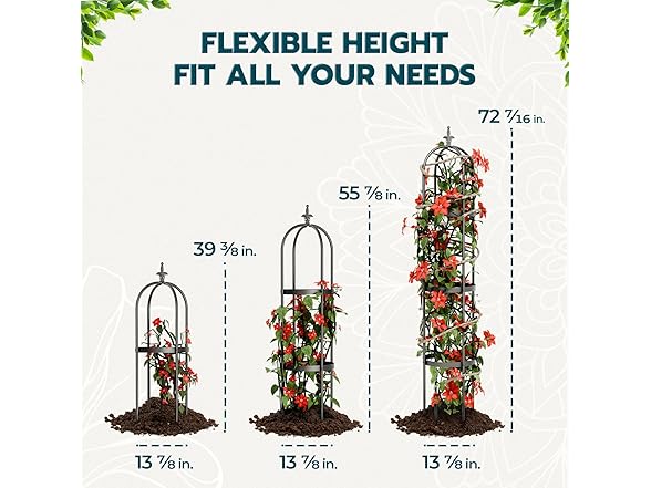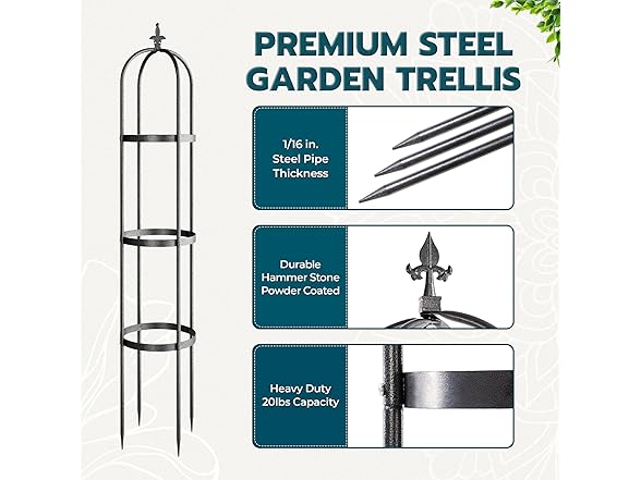 - WEATHERPROOF AND DURABLE: Our garden trellis for climbing plants is crafted with rustproof components and a stone-coated finish, ensuring durability across seasons. The obelisk trellis design provides both practical support and visual appeal