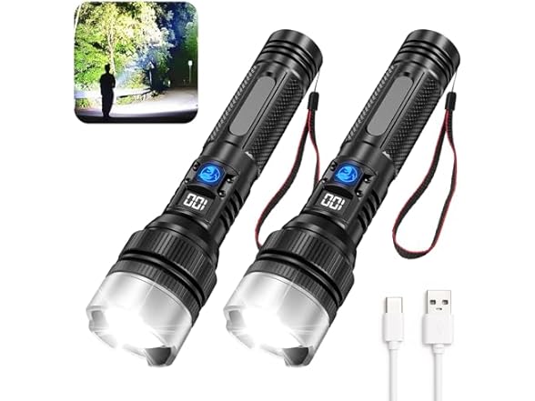 - 【Your Ultimate 2-Pack Lighting Solution for Family Life】The 2025 Ultra-Bright LED Flashlight 2-Pack is here to revolutionize your lighting experience. Each flashlight in this set is equipped with a 2025-upgraded LED, pumping out a staggering 10000 lumens of light. Whether you need to illuminate an entire room during a power outage or light up the backyard for a family gathering, these flashlights have got you covered. Their high-powered beam extends up to 5000 feet, making them perfect for outdoor family adventures like camping, hiking, or even walking the dog at night. With such exceptional brightness, they outshine most high-lumen flashlights on the market.