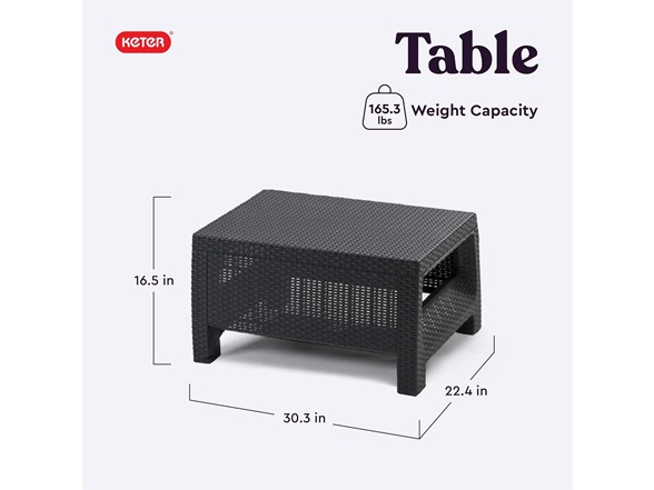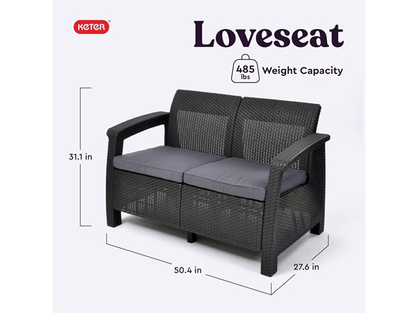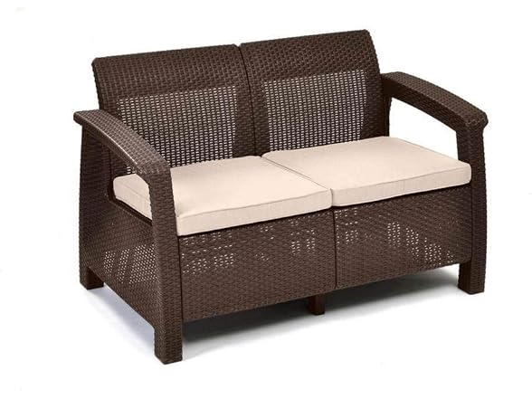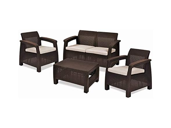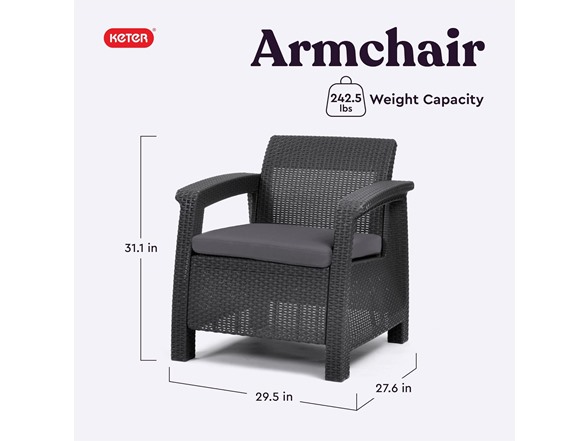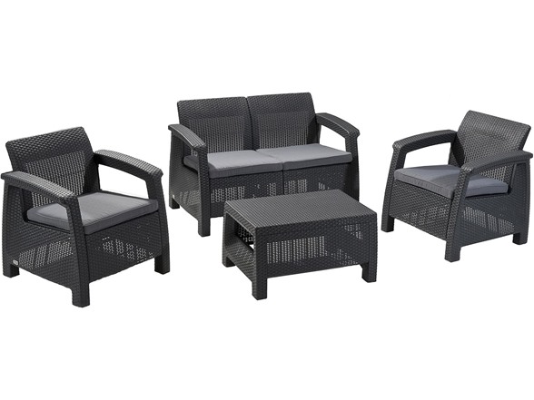 Ultimate indulgence, contemporary design and ergonomic comfort are exactly the right combination for your patio or garden spot. With the Corfu piece from Keter, you'll know right away that relaxation doesn't get any better. With its tantalizing texture and all-natural panache, the rich look of woven rattan has long been the gold standard for exotic outdoor furniture. However, natural rattan is expensive, and it deteriorates rapidly over just a few seasons of use. The Corfu is crafted from Keter plastic, a durable yet natural-looking material that eliminates these issues. The upscale look of rattan furniture with the robust resilience of Keter's unique polypropylene resin construction delivers weather resistant, maintenance-free seating that sets the scene for luxurious outdoor living. Designed for long-term use, the framing of these contemporary pieces is non-metallic, which means you never have to worry about rust. The molded, open-weave material can tolerate high summer temperatures and withstand UV rays without fading. As shown, the Corfu furniture grouping, if purchasing all pieces, features two deep armchairs with luxuriously thick, weatherproof seat cushions, a coffee table and a matching, love seat. You'll love the attention to detail in these pieces. All seating includes ergonomic armrests and reclining, cushioned backs. You'll enjoy your Corfu seating all day long, from an intimate coffee brunch to some personal time with a good book on a long, lazy afternoon.