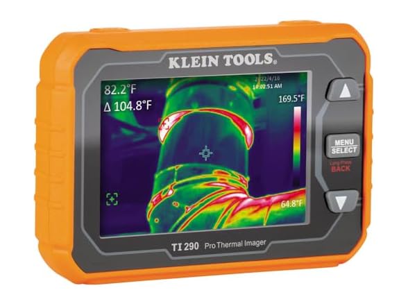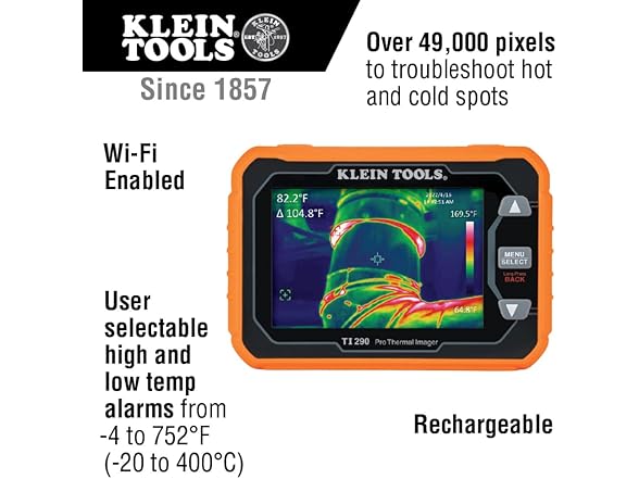 The Klein Tools TI290 is a high resolution, Wi-Fi enabled, professional model USB rechargeable Thermal Imager. The large LCD displays unseen hot and cold spots for instant troubleshooting. Excellent resolution with over 49,000 pixels and your choice of three color palettes. The meter provides high and low temperature points, crosshairs to pinpoint specific temperatures, and options for temperature alarms.