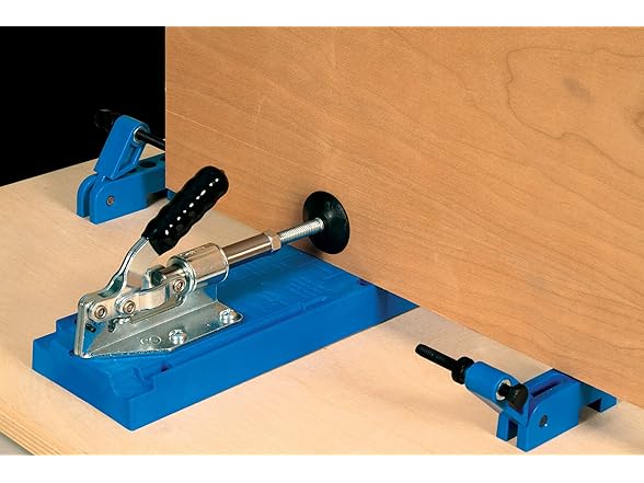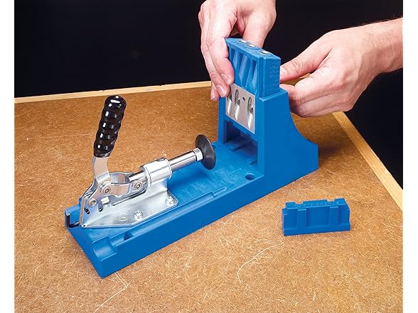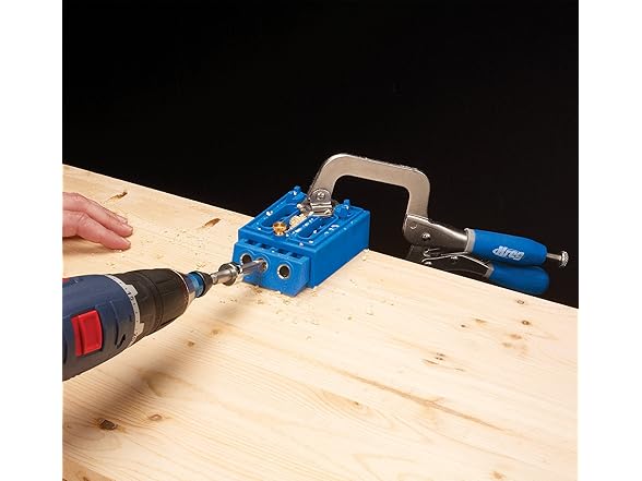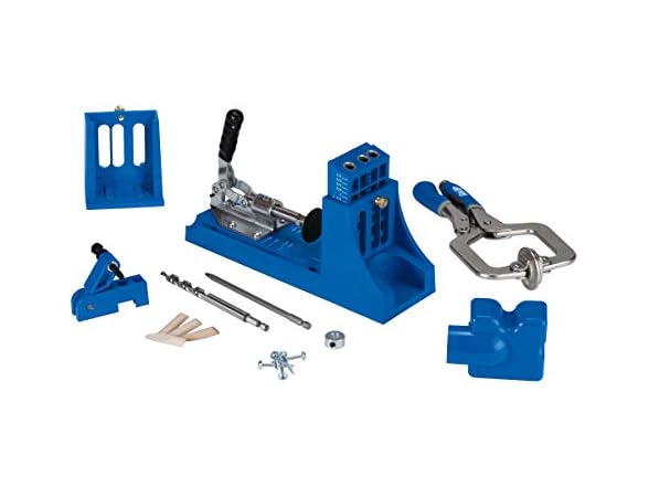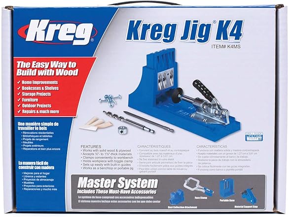 "The Do-It-Yourself Kreg Jig with Bonus Accessories The Kreg Jig K4 Master System is a great choice for any woodworking enthusiast looking for a complete set to get started building with Kreg Joinery. With its solid clamp, large clamping recess, dust collection attachment, material support stop, and removable 3-hole drill guide, this jig truly has it all. The Master System includes a Kreg Jig K4, Bonus Kreg Accessories: the Kreg Face Clamp, Portable Base, and more. Large Clamping Recess The Large Clamping Recess makes it easy to secure your jig to your workbench using Kreg multi-purpose Face Clamps or any common bar clamp or C-clamp. Sturdy Toggle-Clamp The Kreg Jig K4's rear-mounted clamp design has been around since the first Kreg Jig. It's a proven design, offering incredible rigidity and uncompromising workpiece hold-strength. Adjustments are as easy as releasing the locknut and rotating to the correct setting. 3 Tools in 1 Thanks to its removable Drill Guide, the Kreg Jig K4 Master System can serve as many different tools: a sturdy benchtop jig that utilizes the benchtop base for high speed pocket holes, a contractor-grade jig for work on the road through the use of the portable base, and a high-quality repair jig when you add spacer blocks to the bottom of the drill guide. 3-Hole Drill Guide The 3-hole Drill Guide lets you drill pocket holes in a wide variety of material widths and thicknesses—from 1/2"" to 1 1/2"" in 1/8"" increments. Every Kreg Drill Guide features a hardened-steel core, which carries a lifetime guarantee. The core shrouds the bit and supports the workpiece through 100% of the drill-stroke, resulting in minimal bit deflection, reduced tear-out, and a clean, pluggable pocket hole. Material Support Stop The Material Support Stop can be set at any distance from the jig to help you repeat the same pocket holes over and over again. The stop can also be swung out of the way to serve as a height support for larger panels. Glass-Reinforced Nylon Body The blue body of every Kreg Jig K4 is made from a heavy-duty, glass-reinforced nylon. This composite material offers the resiliency and flexibility you need without sacrificing the strength and durability Kreg customers have come to expect. Superior Angle Unlike competing jigs with a shallower angle of approach, the Kreg Jig K4 Master System features an optimized drilling angle, specifically designed to increase driving efficiency and minimize the overall size of the pocket hole. The result is a compact pocket hole, less than 1 1/2"" in size. Wood-Chip Relief The Kreg Jig K4 Master System includes one wood-chip relief hole for every Drill Guide hole, designed to keep the drill bit clear of excess wood chips, minimize drill torque, increase the longevity of your drill bits, and allow you to complete a perfect pocket hole in just one plunge. Featuring a removable drill guide for use with benchtop and portable bases, the Kreg Jig Master System is the ultimate pocket-hole jig, and a great choice for any woodworking enthusiast. For precision and accuracy, it offers 1/8-inch incremental settings for materials 1/2-inch to 1-1/2-inch thick and patented three drill guide fixed spacing on the drill guide. A dust collection shroud means no more woodchips, and the clamping recess allows you to use many different styles of clamps to secure your jig to the workbench. For peace of mind, the hardened steel drill guides are backed by a lifetime warranty."