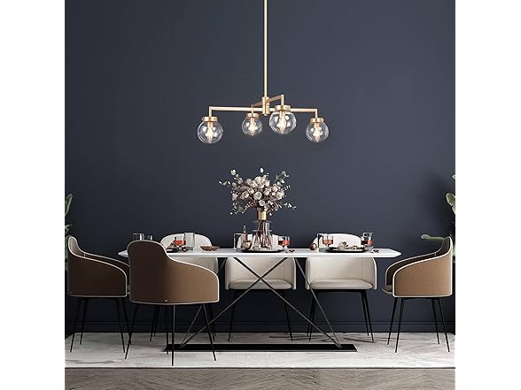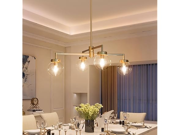 - Unique Modern Chandelier: The gold chandelier showcases two arms of varying lengths that can be rotated into different shapes, embodying innovative designs to refresh your home decor. Adorned with downward clear glass shades, these dining room chandeliers emit a radiant and transparent light, infusing your space with a timeless yet modern ambiance.