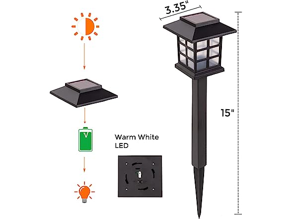 - The solar path lights measuring 15" tall, so you can light up longer walkways or flower beds.
