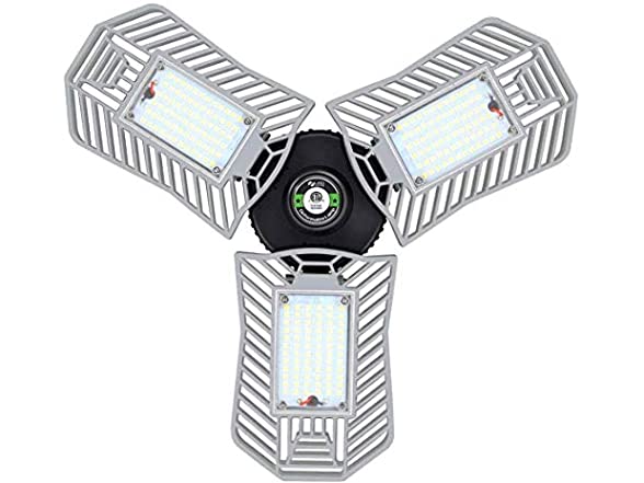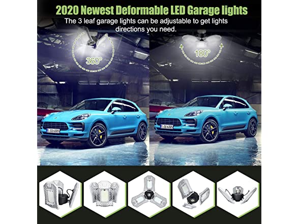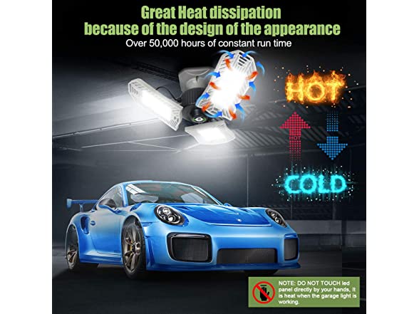 - 【Robust Design And Long Life Time 】80 watt deformable led garage light has 50,000H long life due to high-tech aluminum heating dissipation panels. Compared with common bulbs or shop lights, garage ceiling light use the Aluminum panels for heat dissipation, greatly let the led garage light beads stay cool.