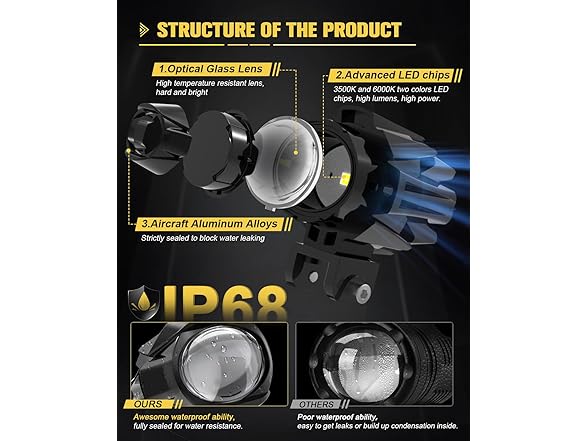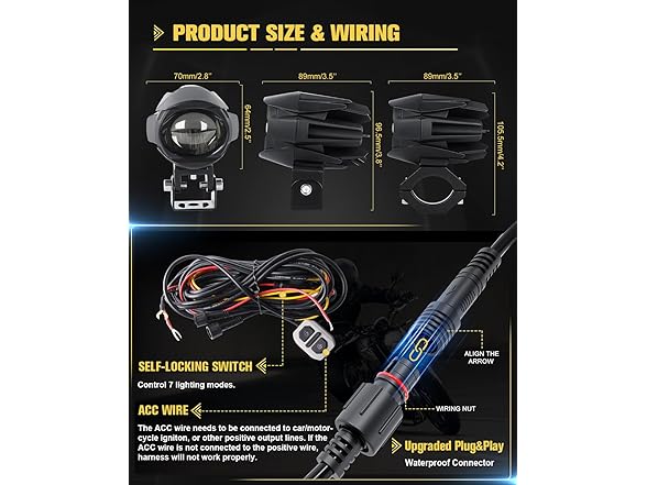 Exceptional Performance: CO LIGHT motorcycle LED fog lights stand out from other similar priced products with only one or two lighting modes. Our lights offer 3 constant lighting and 4 strobe lighting modes: constant white(high beam with 6500K 10000LM), constant amber fog light(low beam with 3000K 8000LM), constant white+amber(combined beam), white strobe simultaneously and alternately, amber strobe simultaneously and alternately. Whether it's night, rainy, snowy, or foggy, these dual color LED lights help you see the road ahead clearly and avoid obstacles promptly.