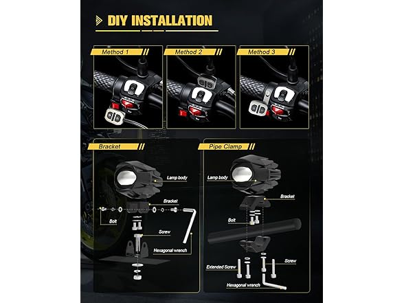 - Versatile Mounting Options: CO LIGHT Motorcycle Auxiliary Lights come with two FREE mounting brackets: normal brackets and clamp brackets. The normal brackets are suitable for vehicles such as motorcycle, ATV, UTV, electric bike, mountain bike, car, truck, boat, and more. The clamp brackets rotate 360 degrees, feature 3M rubber spacers, fit 0.87" - 1.25" crash bars, and allow easy adjustment of beam irradiation angle and distance. We also include a professional motorcycle wiring harness kit at no additional cost.