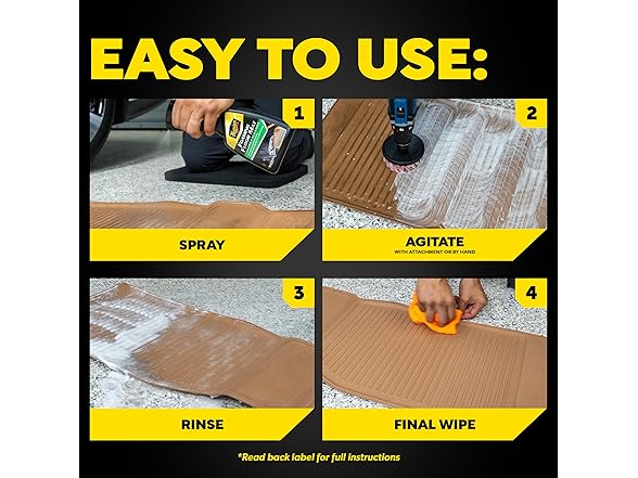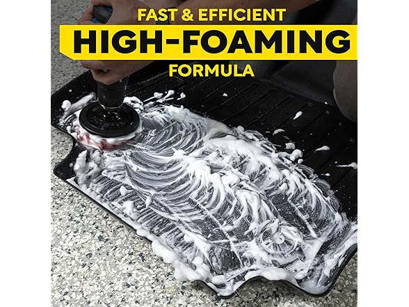 - EFFECTIVE CLEANING FORMULA: This premium auto carpet cleaner spray is formulated with a high-foaming action to thoroughly clean all types of floor mats & automotive carpets. Use with a towel, brush, or drill brush attachment for effective cleaning