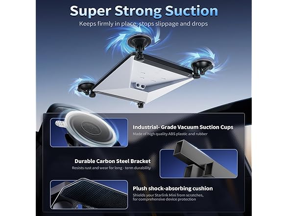 - [Optimized Stability for Uninterrupted Signal]The Starlink Mini suction cup mount features non-slip silicone padding, built-in soft shock-absorbing pads, minimizes vibration and wobbling, providing a stable base for your Starlink Mini,it helps maintain a consistent lock on the satellite network. Enjoy reliable, high-speed internet for streaming, video calls, and remote work, whether you're in an RV, on a boat, or at a remote campsite.
