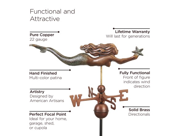 Some say it's better down where it's wetter, but this mermaid couldn't be happier to rise from the sea foam and adorn the rooftop of your home, garage, cupola, barn or gazebo. This pure copper weathervane has a beautiful hand finished green and bronze patina. For over 35 years Good Directions pure copper weathervanes have been unsurpassed in style, quality, and durability – perfect for the house-proud homeowner. Bring The Joy of Outdoor Living℠ to your home with this heirloom-quality piece.