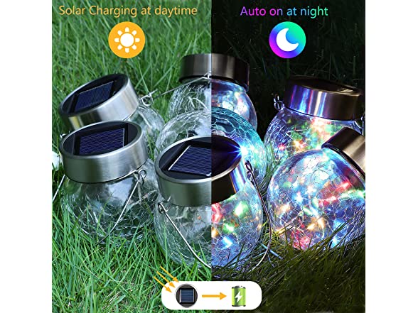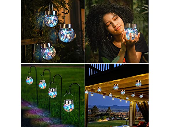 • 100% Solar Powered Glass Ball Lights - These outdoor solar hanging lights are made of durable globe crackle glass, sturdy stainless steel and multi-colored LEDs. Each solar hanging light includes a rechargeable solar energy battery, which will automatically turn on at dusk and turn off to be charged during the day. No energy bills and eco-friendly, just enjoy your green life. Low heat: the sturdy cracked glass design always stay cool to touch.