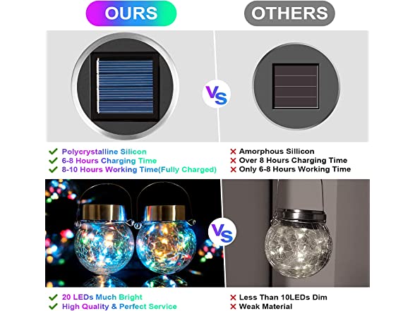 • Upgraded Efficient Solar Panel - Unlike other solar lanterns outdoor hanging lights' panels made of Amorphous silicon, our solar-powered lights cracked glass is made of polycrystalline silicon which has higher light efficacy. Only needs 6-8 hours to be fully charged, last for 8-10 hours working time. (Tips: Make sure to expose it to sunshine for 6 to 8 hours fully charging time before using).