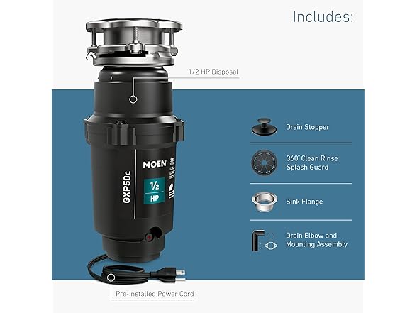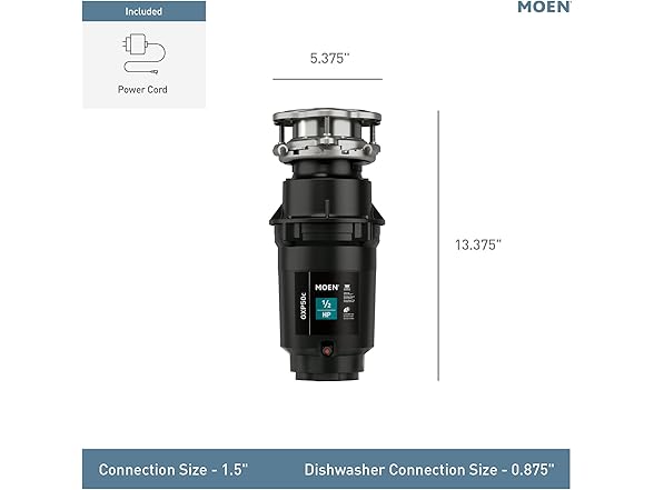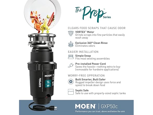 Moen Prep Series PRO Continuous Feed Compact Garbage Disposal for Kitchen Sink with Power Cord, GXP50C