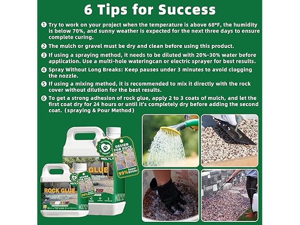 • 【Easy to Use & Fast-Dry】MOLYLY Rock Glue can be applied directly to the surface of mulch materials such as gravel and pebbles by spraying or mixing. It dries quickly within 12-24 hours, effectively fixing the mulch and preventing displacement. It is recommended to apply 2-3 coats, allowing 24 hours between each coat for a stronger bond