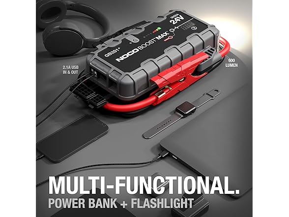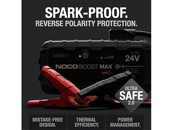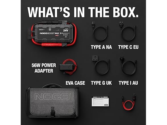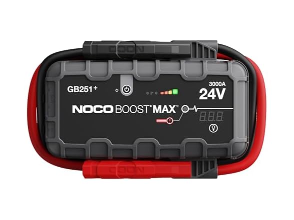 In the box: (1) NOCO Boost Max GB251: 3000A UltraSafe Jump Starter – 24V Lithium Battery Booster Pack, Portable Jump Box, Power Bank & Jumper Cables - for 32L Gas and Diesel Engines
