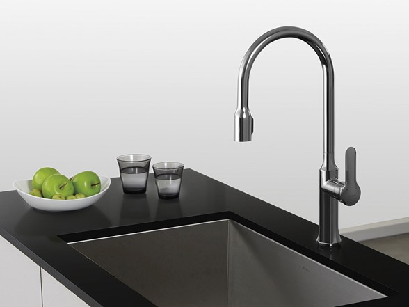 The Nola™ Single Handle Concealed Pull Down Kitchen Faucet has a clean, balanced design that complements the modern kitchen. The pull down sprayer switches from aerated stream to powerful spray, and docks directly into the spout for a seamless look. A slim, flat single lever handle offers effortless temperature and flow control. The flexible smooth-retract hose allows you to easily reach any part of the kitchen sink. Top quality components include a best-in-industry Neoperl aerator, and easy-to-clean rubber nozzles that resist hard water build up for a long lasting powerful flow. Make it uniquely yours with a choice of chrome or stainless steel finish. Mounting hardware and an optional deck plate are included for 1 – 3 hole installation.