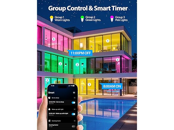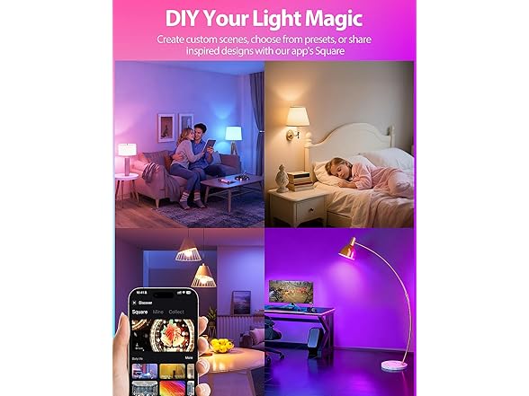 - Music Sync & Group Lighting: Sync your lights to the beat of your favorite music through the app (microphone access and 2.4GHz WiFi required). Easily group multiple smart LED light bulbs to control entire rooms at once, creating a unified and immersive lighting experience.