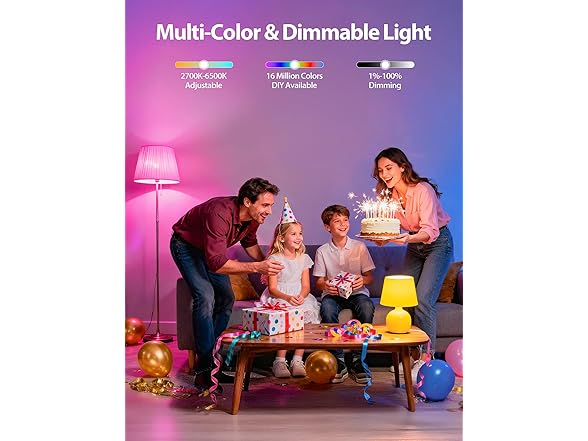 - Vibrant Colors & Adjustable White Light: Choose from 16 million colors and tunable white light (2700K–6500K) to set the perfect mood. Whether for focused work, cozy relaxation, or lively parties, create customized lighting scenes with ease using the app.