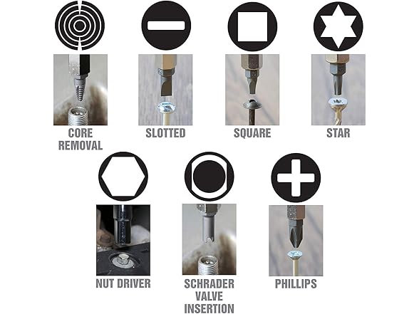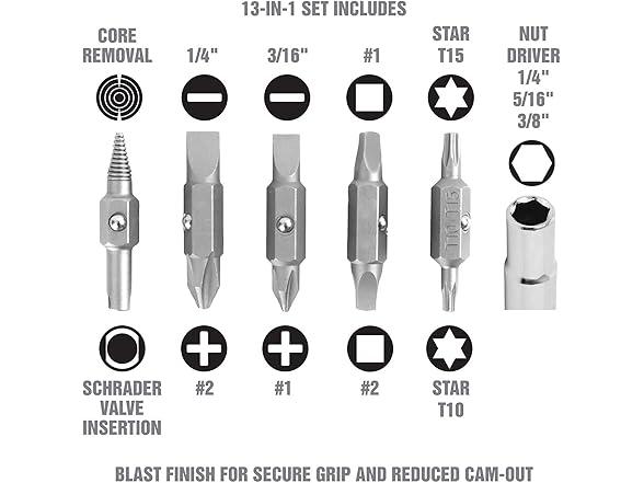 - Schrader Valve Tool: Includes a specialized Schrader valve core removal and insertion bit, allowing for quick and efficient tire maintenance, adding versatility to this multi tip screwdriver.