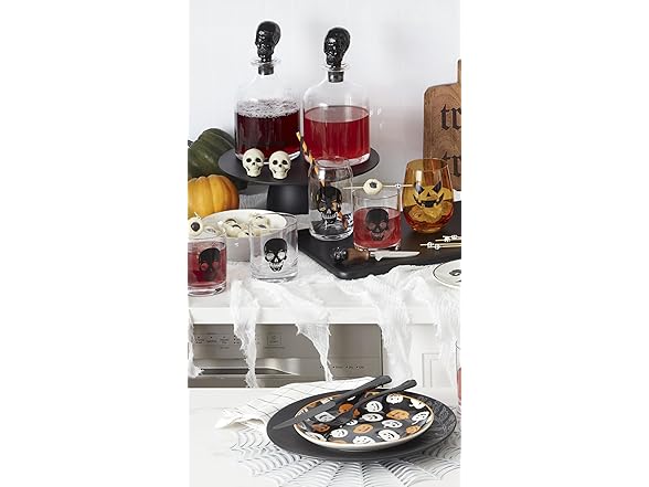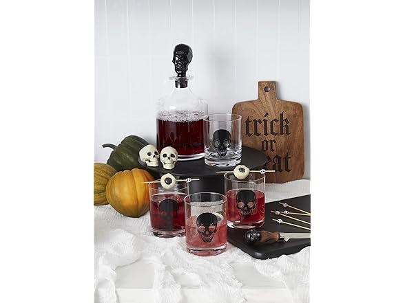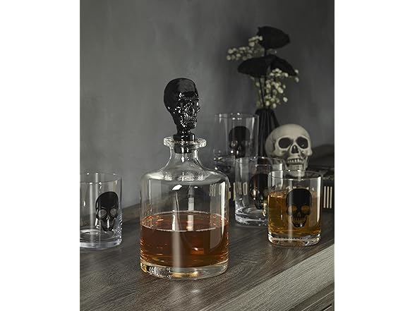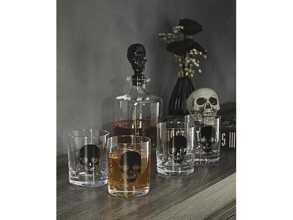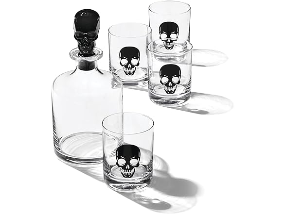 Oneida Barware, 5-Piece Skeleton Whiskey Set, 4 Drinking Glasses & 1 Decanter, Dishwasher Safe, Halloween Decor Indoor, Halloween Table Decorations for Party, Skeleton Themed (4 Glasses, 1 Decanter)
