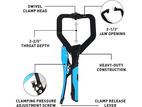 - EFFORTLESS CLAMPING - Say goodbye to manual adjustments with our C Clamp locking pliers. Just tweak the pressure screw, lock with one hand effortlessly, saving you time and strain on your wrist.