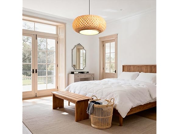 Elevate your home’s aesthetic with this Natural Bamboo Pendant Light, a perfect blend of organic craftsmanship and modern industrial design. Each lampshade is meticulously hand-woven by skilled artisans, ensuring that every piece carries a unique, soulful touch that mass-produced plastic fixtures simply cannot replicate. Whether you are looking to create a cozy Bohemian retreat in your bedroom, a Coastal-inspired dining area, or a Modern Farmhouse kitchen, this versatile woven chandelier is the ultimate focal point. When illuminated, the bamboo lattice diffuses the light to cast soft, rhythmic patterns across your walls, instantly turning any room into a serene sanctuary. Designed with the Canadian home in mind, we utilize a robust iron canopy and a reinforced hanging cord for maximum durability. The 15.75-inch shade provides ample light coverage while maintaining a minimalist footprint. Technical Specifications: Shade Diameter: 15.75" (40 cm) Max Total Height: 55.12" (140 cm) Cord Length: 47.24" (120 cm) - Adjustable Material: Natural Bamboo, Premium Iron, Durable Plastic Net Weight: 0.67 kg (1.48 lbs) Bulb Base: E26 (Max 60W) Certification: UL & FCC Listed Dimmable: No Package Includes: 1 x Bamboo Shade, 1 x Iron Canopy & Cord Set, 1 x Mounting Accessory Kit, 1 x User Manual. (Bulb is not included).